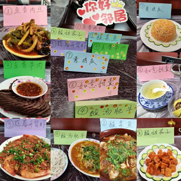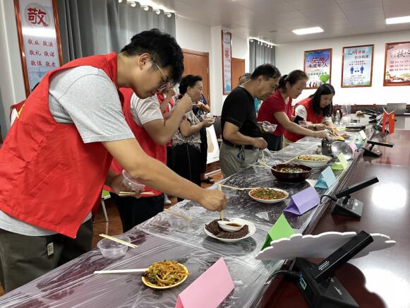 活動(dòng)當(dāng)天,居民們端著自家的拿手好菜,早早地到了活動(dòng)室擺放好,魚香肉絲、五香牛肉、蒜蓉開背蝦、酸湯肥牛、酸菜魚、如意甜羹、素雞瓜、酸甜茄子等來自各個(gè)家庭的菜品把桌上的空位填滿,讓本場活動(dòng)燃起一絲絲的火花。