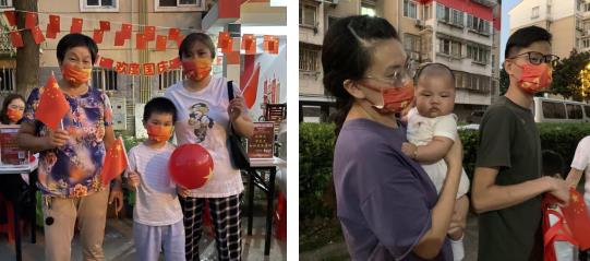 樓棟門口,五星紅旗隨風飄揚,在“歡度國慶”的標語下,路過的居民們積極參與到知識問答活動中。社區(qū)準備了印有“我愛祖國”字樣的紅色國慶口罩、國旗、國慶氣球組成的慶國慶小禮包,送給參加活動的大朋友、小朋友們。