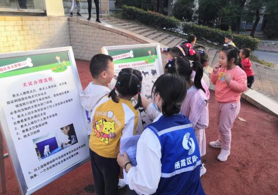 活動中,“博愛家園”積分制志愿者、馬群派出所民警向來往居民發(fā)放文明養(yǎng)犬宣傳折頁,向居民發(fā)出“文明養(yǎng)犬”的倡議。社區(qū)文明勸導(dǎo)員還在廣場上依次擺好“文明養(yǎng)犬倡議書”、“犬證辦理流程”、“禁養(yǎng)烈性犬、大型犬的品種圖解”的展板,向前來參與活動的居民講解養(yǎng)犬規(guī)定。許多小朋友在家長的帶領(lǐng)下也來到了廣場上,圍在文明勸導(dǎo)員的身邊,認真地聽文明勸導(dǎo)員講解養(yǎng)犬小常識,還不時點點頭,表示自己聽明白了。此外,社區(qū)還精心設(shè)計了“養(yǎng)犬知識互動問答”環(huán)節(jié),通過提問加深居民對養(yǎng)犬知識的了解,并將牽引繩作為禮物送給答對的居民。