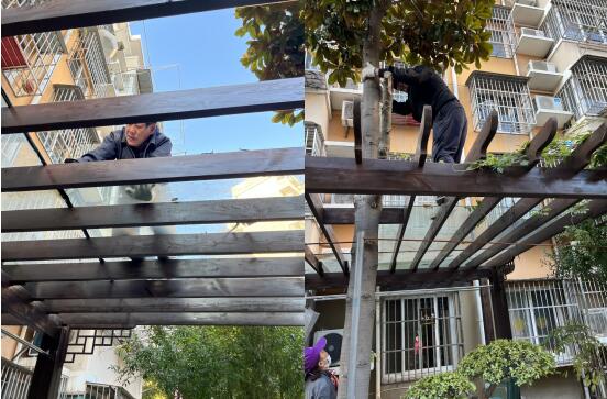 據(jù)悉,此違建屬于歷史違建,是小區(qū)居民私占綠化區(qū)域搭建的花架,大小約10㎡左右,主要想用來停放電瓶車,養(yǎng)花,以及葡萄種植。