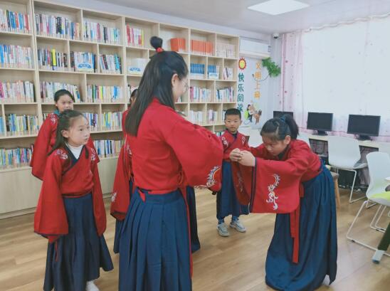 當天,孩子們來到教育服務室中,在志愿者們的幫助下穿上了漢服,學習傳統(tǒng)禮儀?,F(xiàn)場,志愿者講解了漢服背后蘊藏的豐富內涵和精神意蘊,帶領他們體驗、了解漢文化。
