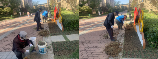 活動(dòng)期間,大家有的用鐵鍬翻地、有的挖坑撒種,各個(gè)環(huán)節(jié)銜接有序,配合默契,利用手上的修剪工具,給綠化植被造型,“整容”;給已枯萎的花草進(jìn)行補(bǔ)種;同時(shí),將參差不齊的樹叢細(xì)心修補(bǔ)。經(jīng)過(guò)修剪后的樹叢橫平豎直,植被在被修剪后增加了通風(fēng)與透光,陽(yáng)光一照進(jìn)來(lái),顯得格外精神,道路兩旁的花朵也爭(zhēng)相斗艷,社區(qū)面貌換然一新,整齊美觀。風(fēng)兒輕輕,草兒茵茵,烈日下的“園丁們”辛苦勞作著,在社區(qū)與他們的努力下,小區(qū)的花草書木熠熠生輝,充滿了生機(jī),保證了植物良好生長(zhǎng)。