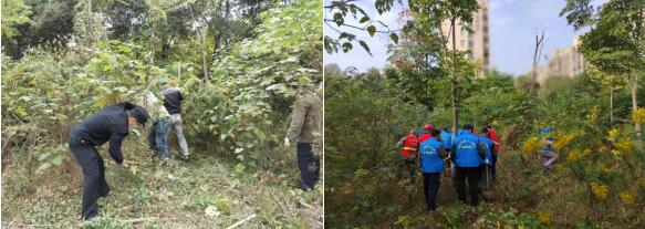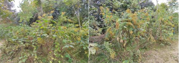 帶隊(duì)的社區(qū)副主任吳學(xué)坤走近細(xì)看后發(fā)現(xiàn)了疑點(diǎn):這些“小黃花”不僅根莖高,花序朝著一側(cè)生長(zhǎng),從總苞片、單個(gè)小花序一般為2-3毫米,正是嚴(yán)重影響生態(tài)平衡的外來(lái)入侵物種——“加拿大一枝黃花”。此物種因沒(méi)有天敵、繁殖能力強(qiáng),哪怕是種子和莖稈灑落土壤也能長(zhǎng)出完整的植株,還會(huì)抑制周邊其他植物的生長(zhǎng),一旦擴(kuò)散蔓延將嚴(yán)重危害轄區(qū)環(huán)境和生態(tài)安全。根據(jù)森林防火部門要求,吳學(xué)坤有多次清除該物種的經(jīng)驗(yàn),證實(shí)是“加拿大一枝黃花”后,便立刻聯(lián)系城管隊(duì)員、城市治理公眾委員、志愿者協(xié)同開(kāi)展清除專項(xiàng)行動(dòng)。