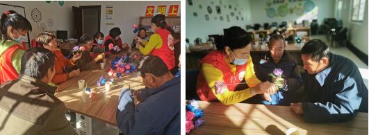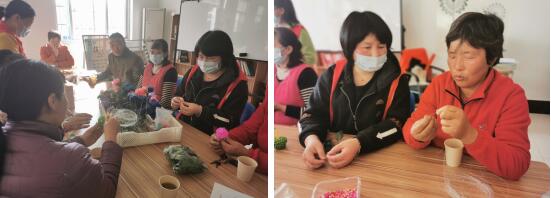 “這個珠子穿在哪?”,“這里哦~”;“這里我不會做了!”,“沒關(guān)系,慢慢來,我教你。”這是當天最常聽到的一些話,手工老師和志愿者們手把手耐心的教每一位殘疾人如何制作手工產(chǎn)品,并把制作技巧一一傳達到位,使得殘疾人在指導下有序進行輔助性就業(yè)。