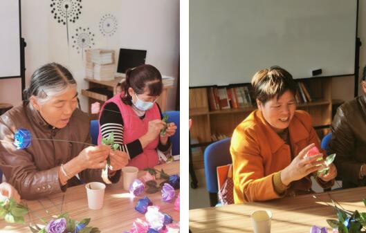 首先,志愿者把殘疾人分成了兩組,一組穿串珠,另一組則學習制作絲帶玫瑰花。第一組手工老師示范了如何將珠子穿進繩子里,如何區(qū)分珠子顏色以及如何打結(jié);另一組手工老師則教殘疾人怎樣把絲帶玫瑰花瓣粘好以及如何把葉子和花朵組裝在一起。兩組分工有序,各自忙碌著。