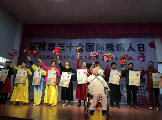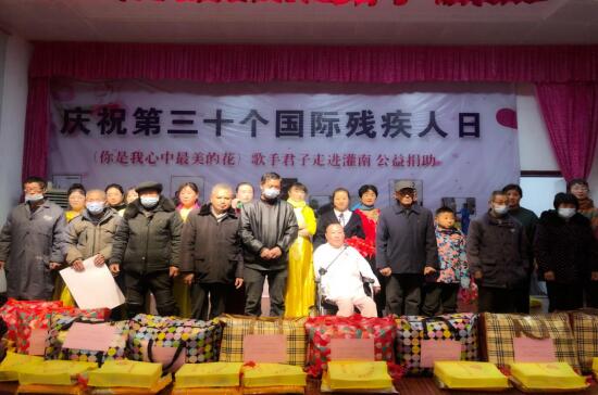 君子老師自強(qiáng)不息的故事深深激勵(lì)著現(xiàn)場的殘疾人朋友,君子的愛心之路令現(xiàn)場觀眾備受感動(dòng)。君子現(xiàn)場演唱了歌曲《活出個(gè)樣來給自己看》、《你是我心中最美的花》兩首歌曲,百名觀眾硬是讓君子唱出了萬人演唱會(huì)的氛圍,大家全體起立,揮舞著雙手,氣氛實(shí)在是火爆。鎮(zhèn)郊藝術(shù)團(tuán)和當(dāng)?shù)氐膼坌乃囆g(shù)家們?yōu)楝F(xiàn)場觀眾表演了《感恩的心》、《愛的奉獻(xiàn)》舞蹈等十多個(gè)精彩紛呈的節(jié)目。十月份機(jī)構(gòu)工作人員和灌南公益團(tuán)隊(duì)取得聯(lián)系,灌南公益團(tuán)隊(duì)通過一個(gè)月的走訪了解,征集了20位困難殘疾人,活動(dòng)現(xiàn)場為20戶貧困殘疾人發(fā)放生活物資,為他們送上來冬日里的溫暖。