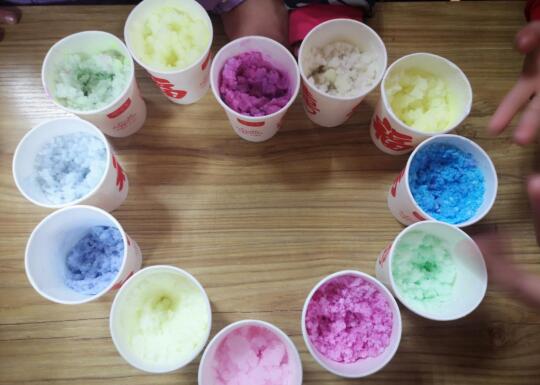 活動開始前,高老師向大家特別強調(diào)安全第一,雪粉無色無味,但是一定不能放到嘴里。向同學(xué)們介紹完人造雪的制作方法后,高老師協(xié)助同學(xué)們把雪粉放入實驗杯中,加入不等量的水,然后迅速攪拌,觀察雪粉的含水量及其變化。隨后,同學(xué)們開始制造彩色雪,根據(jù)自己的喜好,選擇粉色、綠色、藍(lán)色、熒光色等等不同的色彩,加入制造好的雪中,充分?jǐn)嚢?。同學(xué)們驚訝地發(fā)現(xiàn),含水量不同,雪粉呈現(xiàn)的狀態(tài)也不同;加入色素的數(shù)量不一樣,雪的顏色深淺也有不同。有的同學(xué)們就突發(fā)奇想,相互之間交換各自顏色的雪,調(diào)制出混色雪,不同原色、比例的混合創(chuàng)造出了更多種色彩。這些奇妙的發(fā)現(xiàn)讓大家都對生活中的物理知識產(chǎn)生了濃厚的興趣。