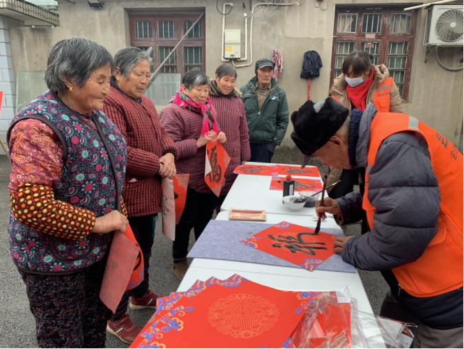 活動(dòng)伊始,社區(qū)服務(wù)志愿者進(jìn)行測(cè)量體溫、簽到等防疫措施的“標(biāo)準(zhǔn)動(dòng)作”。在老人們進(jìn)入活動(dòng)地點(diǎn)后,志愿者們將早晨煮好的臘八粥分發(fā)至社區(qū)老人手中,老人們手捧溫暖的臘八粥露出笑容。志愿者沈慶華在一旁用毛筆現(xiàn)場(chǎng)書寫“福”字送給社區(qū)老人,在筆走游龍間,以墨書寫的“福”在大紅色的紙上更顯生機(jī)。