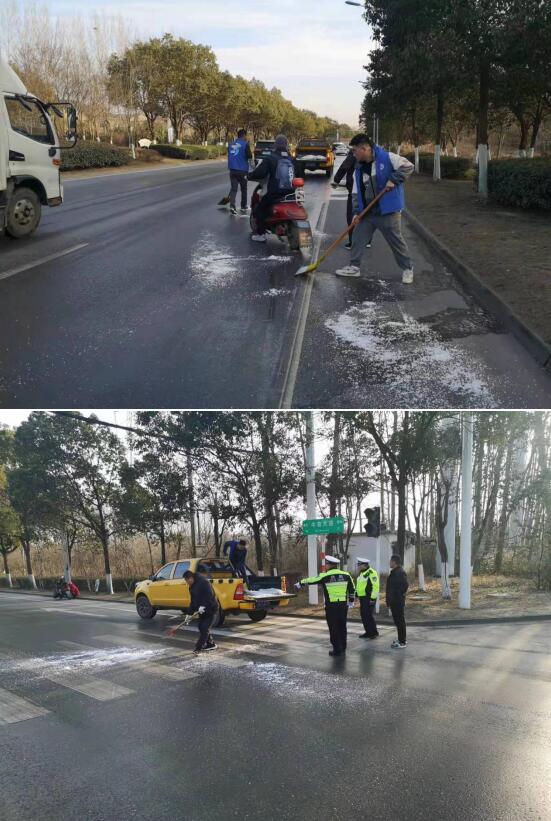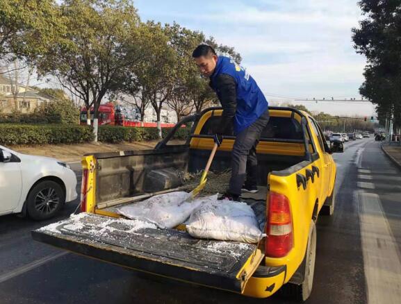 發(fā)現(xiàn)此情況后,南京市江寧區(qū)谷里街道箭塘社區(qū)網(wǎng)格員們第一時(shí)間從社區(qū)拖來(lái)了融雪劑、鐵鍬等工具,趕至現(xiàn)場(chǎng),分工合作,火速開展了除冰行動(dòng)。箭塘社區(qū)001號(hào)網(wǎng)格員虞鵬飛負(fù)責(zé)撒融雪劑,003號(hào)網(wǎng)格員鄒光輝負(fù)責(zé)用鐵鍬鏟除道路上的冰,002號(hào)網(wǎng)格員何宗敏指引后方車輛盡量在無(wú)冰路段行駛。不一會(huì)兒,路上的冰就被網(wǎng)格員一鍬一鍬鏟出干凈了,切實(shí)保障了出行人員的安全。