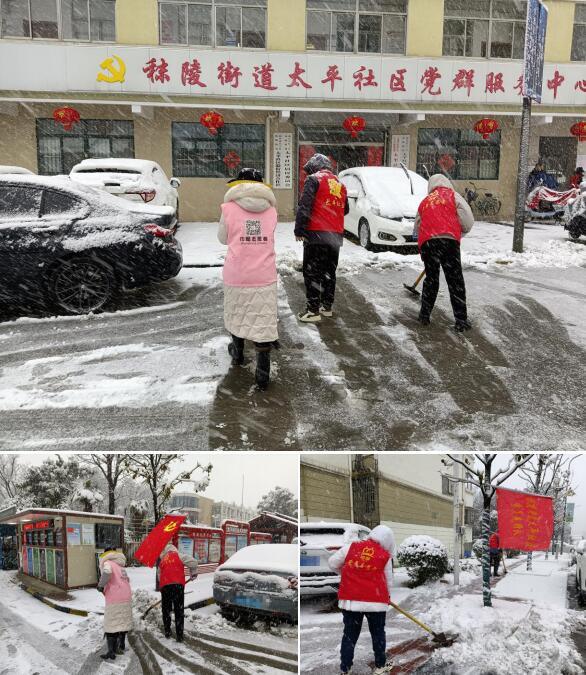 2月7日,天降大雪,江寧區(qū)秣陵街道太平社區(qū)黨員志愿者們攜手社區(qū)全體工作人員、網(wǎng)格員、物業(yè)等,開展志愿服務(wù),清掃積雪,為居民送去安全與便利。