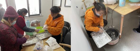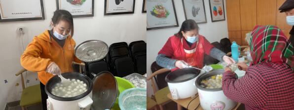 活動正式開始,志愿者將提前準備好的面粉、芝麻餡、白糖食材擺在桌子上,大家爭先恐后地包起湯圓來:先拿和好的糯米粉團取一小團,在手上搓成圓形;再壓成餅狀,在其中包上芝麻餡搓成丸狀,一個個圓溜溜的湯圓就制作完成了。圓滾滾的湯圓,包裹著美好的祝愿,包裹著甜美的生活。志愿者將做好的湯圓放進鍋里煮好,放進一次性餐盒里,分發(fā)給轄區(qū)內(nèi)的老人們,“太感謝你們了,能在元宵佳節(jié)吃到熱乎乎的湯圓真的是太暖心了!”老人們說道。