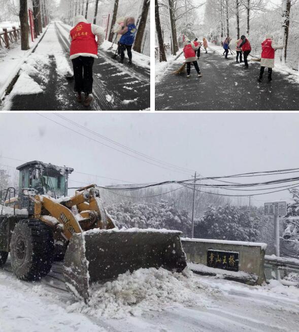 網(wǎng)格員、黨員志愿者、新時代文明實踐志愿者、巾幗志愿者……各單位的人員組成了鳳凰村掃雪突擊隊,戴上手套和口罩,拿著鐵鍬和掃帚,來到轄區(qū)內(nèi)的主要道路上,鏟的鏟、掃的掃,協(xié)調(diào)合作、有序分工,將道路上的積雪堆在路邊。在一些冰雪比較厚重的道路、橋面上,挖機開路,將冰雪鏟除,清出一條條便利通行的道路。清掃積雪的過程中,裹上白衣的樹木和各色馬甲們一起,形成了冬日一道靚麗的風景線。