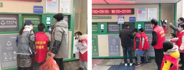 紙上得來終覺淺,絕知此事要躬行,課程結束后,由家長帶領自己的孩子進行廂房前值守,小志愿者們身穿志愿者紅馬甲,向投放垃圾的居民們發(fā)放了垃圾分類的宣傳材料,并引導居民養(yǎng)成良好的定時投放習慣,在廂房開放時間將分類好的垃圾投入相應的桶內,居民都非常配合孩子們,也對他們的行為給予鼓勵和贊揚。得到了爺爺奶奶叔叔阿姨們的肯定和認可,孩子們也更加積極主動地上前和居民進行交流。