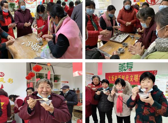 志愿者和居民朋友們有條不紊地親手制作湯圓,不一會兒,芝麻餡兒湯圓紛紛成型。一個個圓圓胖胖的湯圓煮熟后,冒著騰騰熱氣,志愿者們將煮好的湯圓親自遞給在場的每一位居民。