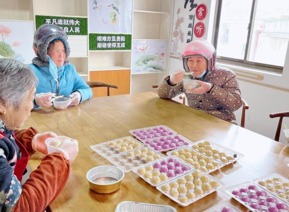 活動(dòng)開始,志愿者和社工將提前采購好的糯米粉、食用染料、黑芝麻等材料和碗、元宵收納盒等工具擺放在桌子上,邀請老人們一起“滾元宵”。大家圍坐在桌邊,聊一聊生活,手下卻不停,揉面、拌餡、滾元宵,在一片歡聲笑語中,將煩惱“滾走”,把幸福“團(tuán)來”。看著一顆顆飽滿可愛的元宵誕生在手中,每個(gè)人的臉上抑制不住喜悅的笑容。將元宵煮好后,大家一起品嘗了自己的作品,香甜軟糯的元宵咬在唇齒間,香氣四溢,充盈了這個(gè)元宵佳節(jié)。