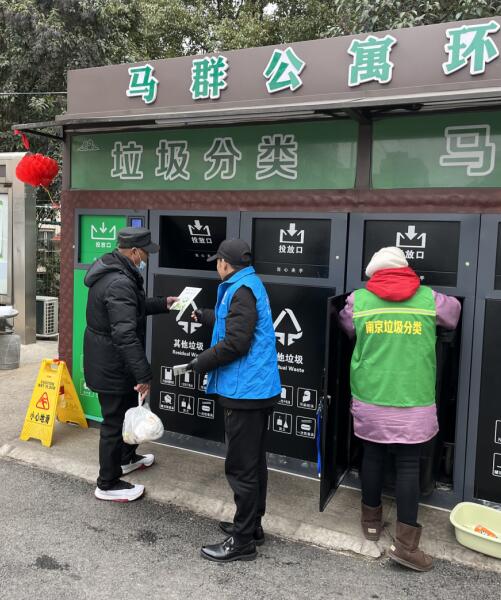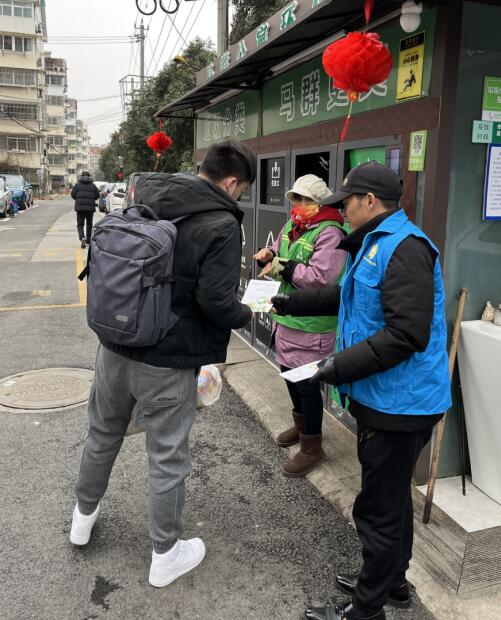 2月中旬,南京市棲霞區(qū)馬群街道果場社區(qū)“齊益果”城市治理志愿者在社區(qū)馬群公寓小區(qū)的垃圾分類房前,就小區(qū)垃圾分類積分制向居民進(jìn)行宣傳和倡導(dǎo)。
