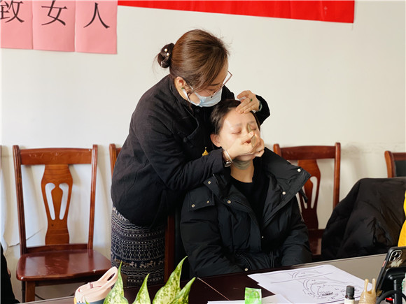 活動正式進(jìn)入主題,主講老師通過“內(nèi)在女神祈禱”和“外在養(yǎng)護(hù)分享”兩個(gè)環(huán)節(jié)的互動和分享。“我內(nèi)在的女神,我以我的性別為榮”、“我內(nèi)在的女神,我以我的情緒為榮”、“我內(nèi)在的女神,我以我的身體為榮”......養(yǎng)護(hù)環(huán)節(jié),老師教授現(xiàn)場女性如何使用撥筋棒進(jìn)行日常面部養(yǎng)護(hù)。