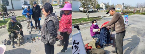 考慮到一些居民的需求,退役軍人志愿者在廣場上為大家提供愛心理發(fā)、裁剪衣服、磨剪子磨刀等各項服務。原本生銹的菜刀重新鋒利锃亮,破損的衣服也被縫上細密結實的針腳……一項項貼心服務切實為居民送去了方便,也促進了軍民共建。