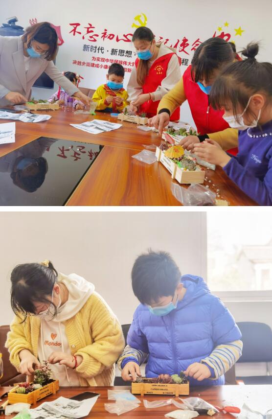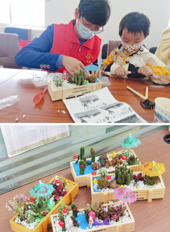大家饒有趣味地制作起盆景,填土、鋪石、種植、擺放玩具……大家各自發(fā)揮想象,布局創(chuàng)作自己的盆中花園。伴隨著歡聲笑語,一盆盆有模有樣的盆栽完成了,現(xiàn)場氣氛十分活躍。在多肉種植環(huán)節(jié)中,孩子們還不忘在花盆中插上一把小傘,為多肉植物遮風(fēng)擋雨。