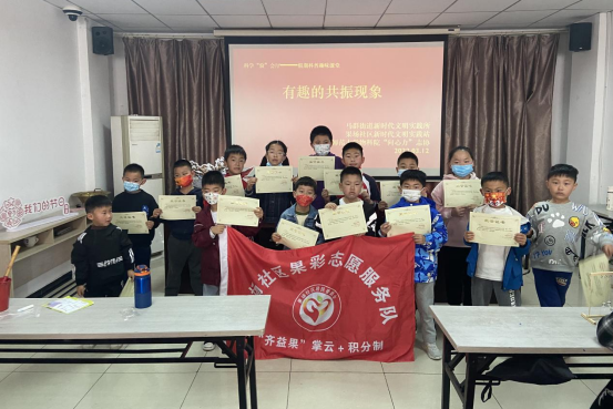 現(xiàn)場(chǎng),講師還通過(guò)PPT及視頻向大家展示了“共振”原理在科學(xué)領(lǐng)域的廣泛應(yīng)用,這極大的提高了社區(qū)未成年人探索科學(xué)的興趣。針對(duì)本次周課表現(xiàn)優(yōu)異的同學(xué),社區(qū)新時(shí)代文明實(shí)踐站志愿者向他們頒發(fā)獎(jiǎng)狀以示鼓勵(lì),進(jìn)一步激發(fā)同學(xué)們的學(xué)習(xí)熱情。