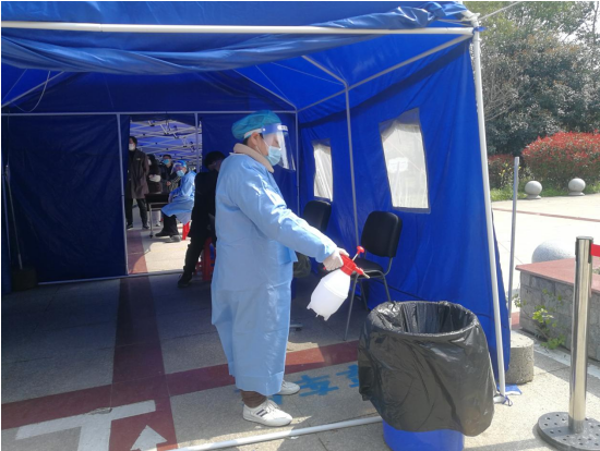 在核酸檢測出口處,很多人都在嘔吐,志愿者孟枝平不怕臟不怕累,在做好自身防護(hù)的同時(shí),及時(shí)打掃現(xiàn)場垃圾,規(guī)范垃圾分類并對垃圾桶進(jìn)行消毒。一天忙下來,腰酸腿疼,口罩換了一個(gè)又一個(gè),但每個(gè)人服務(wù)熱情絲毫沒有減少,始終面帶微笑服務(wù)村民。