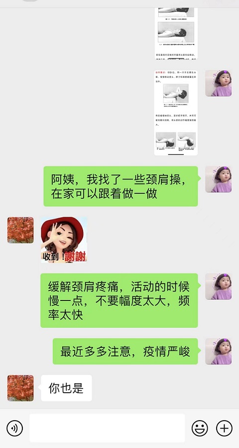 然后結(jié)合殘疾人居家生活特點和實際肢體功能狀況,兼顧趣味性和可操作性,摸索出了適合居家康復(fù)的訓(xùn)練方式,每個人情況不同針對性不同所以實行不同的方案和計劃,老師將整理好的訓(xùn)練計劃(計劃里有圖有文字還有訓(xùn)練的視頻資料)發(fā)送到每個人微信里,讓殘疾人根據(jù)圖片和視頻里的動作進(jìn)行自我訓(xùn)練。要求每天在安全情況下根據(jù)計劃訓(xùn)練30分鐘。有些殘疾人沒有聊天軟件,老師們根據(jù)情況都進(jìn)行電話慰問和指導(dǎo),通過居家康復(fù)活動,大部分殘疾人能在家屬的配合下完成訓(xùn)練計劃。大家對于視頻圖片不理解的部分都積極詢問,康復(fù)老師也都進(jìn)行耐心解答。
