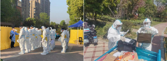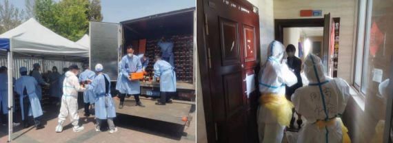 醫(yī)護人員在社區(qū)工作者的帶領(lǐng)下每天穿梭在各個單元樓之間,挨家挨戶敲門,上門為居民們進行核酸采樣。一日一測,嚴(yán)防嚴(yán)控,應(yīng)檢盡檢,使每位封控區(qū)的居民都經(jīng)過排查,確保其安全健康。同時,志愿者也在社區(qū)微信群內(nèi)統(tǒng)計居民群眾數(shù)據(jù),提前與居民聯(lián)系,他們穿上防護服,推起小推車,將蔬菜、肉、蛋、奶、衛(wèi)生紙等生活物資按需送到每戶人家手中。物資送進去,垃圾收回來,配送全程不忘噴射酒精進行消殺,切實保障了居民生活在安全的前提下正常運轉(zhuǎn)。