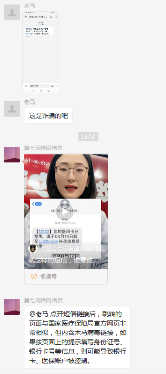 近日,家住金桂園的居民馬先生在“掌上云”網(wǎng)格群內(nèi)詢問自己收到的是否為詐騙短信,短信顯示“您的醫(yī)用保險卡暫時無法報銷”并附有信息完善鏈接。網(wǎng)格員當(dāng)即制止,并告知馬先生,這是短信詐騙,通過誘導(dǎo)居民點擊釣魚網(wǎng)址鏈接,更新完善資料,進行銀行卡賬戶盜刷,從而實施詐騙。