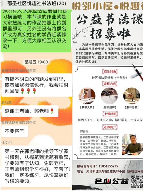 為豐富和活躍社區(qū)居民的精神文化生活,讓居民感受中國的傳統(tǒng)文化,近日,南京市江寧區(qū)東山街道邵圣社區(qū)聯(lián)合南京市會(huì)心社會(huì)工作服務(wù)中心開設(shè)悅?cè)ど鐣ò?,由社區(qū)志愿者書法家郭秀文老師為大家授課,報(bào)名的居民從30歲到70歲,老中青三代學(xué)員匯聚一堂,共同感受書法的魅力。