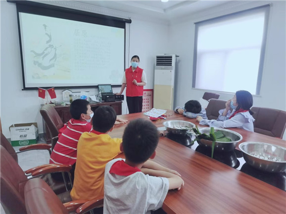 首先,志愿者張老師以PPT的方式,聲情并茂地向大家介紹端午節(jié)的由來、風(fēng)俗和意義,孩子們積極互動(dòng),紛紛搶答有關(guān)端午節(jié)的各項(xiàng)習(xí)俗。“我們要包粽子!”“端午節(jié)要賽龍舟!”“端午節(jié)是為了紀(jì)念屈原的!”