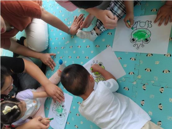 活動(dòng)現(xiàn)場(chǎng),老師讓小朋友們聽聲識(shí)物,先是小狗,再是小貓,當(dāng)聽到“呱呱”的聲音時(shí),小朋友們答案不一,有的小朋友說(shuō)是鴨子,有的說(shuō)是青蛙。這時(shí)老師補(bǔ)充道:“這個(gè)聲音每天晚上池塘邊還可以聽到哦!”話音剛落,小朋友們統(tǒng)一答案是青蛙。“答對(duì)啦!”老師說(shuō)道,隨后給每位小朋友發(fā)了一張青蛙圖片,需要小朋友們進(jìn)行涂色。涂色過(guò)程中老師一對(duì)一地指導(dǎo)小朋友們認(rèn)識(shí)顏色、學(xué)習(xí)握筆姿勢(shì)等等。最后大家一起參與“青蛙跳”小游戲,小朋友和家長(zhǎng)們?cè)跉g聲笑語(yǔ)中結(jié)束了今天的課程。