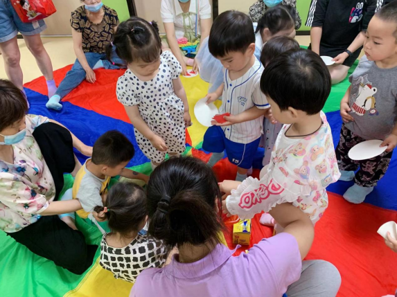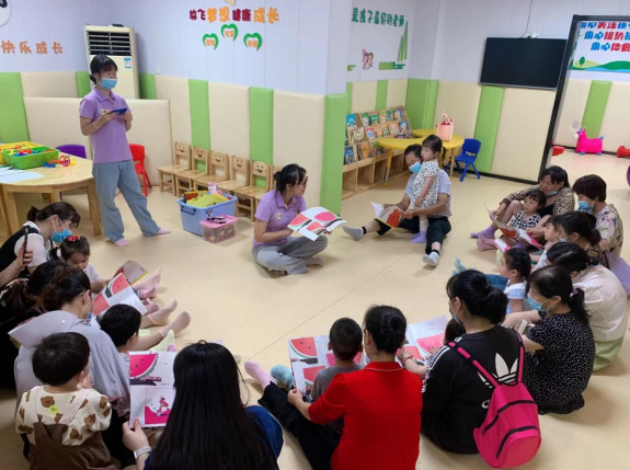 在親子活動室,負(fù)責(zé)人提前準(zhǔn)備好活動所用的物料,包括洗手液、小蜜蜂、鈴鼓、繪本、油畫棒、三角形手工、西瓜畫、彩虹傘等,琳瑯滿目的活動材料吸引了孩子們的目光。在活動內(nèi)容的安排上也是豐富多彩,有歌曲、親子閱讀、動手以及運動環(huán)節(jié),充分調(diào)動孩子們參與的積極性。