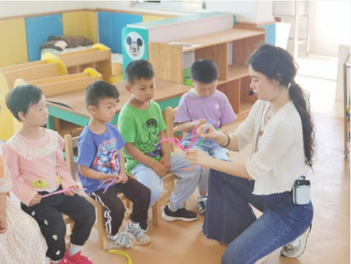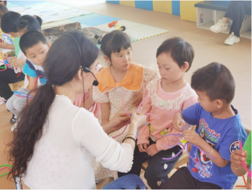 活動(dòng)最后,孩子們?cè)诶蠋煹闹笇?dǎo)下,用扭扭棒做出一朵朵小花發(fā)卡和戒指,“我想把小花花送給老師,謝謝老師陪我們一起玩游戲。”