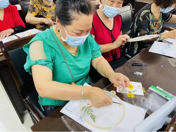 活動進入正式主題,社工首先講解了壓花團扇的歷史傳統(tǒng),展示了精美的壓花團扇,每個人都迫不及待地想要開始親自動手。大家在社工的耐心指導下,經(jīng)過花材搭配、設計構圖、上膠粘貼等步驟后,一把把獨一無二精美的團扇就制成了。大家都高興地表示,在夏天一把小扇在手中搖一搖,既能驅(qū)趕蚊蟲,又能帶來絲絲涼風。在一片歡樂溫馨的氛圍中,活動也逐漸接近尾聲,參加活動的婦女們都表示非常喜歡這樣的活動,也期待著下一場活動的開展。