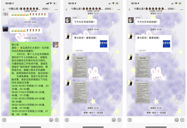 社區(qū)相關(guān)事宜的通知、社區(qū)新時(shí)代文明實(shí)踐站的相關(guān)活動(dòng)及困難補(bǔ)助名單的公示等,都會(huì)在這一平臺(tái)上告訴給居民們。如疫情防控以來,社區(qū)每輪的核酸檢測(cè)和疫苗的流動(dòng)核酸車接種時(shí)間安排,社區(qū)工作人員都會(huì)通過平臺(tái)讓居民能夠快速知曉。近期還推送了露天電影通知、南京市醫(yī)保信息平臺(tái)升級(jí)遷移工作等其他通知。