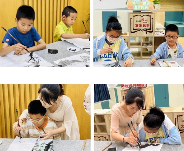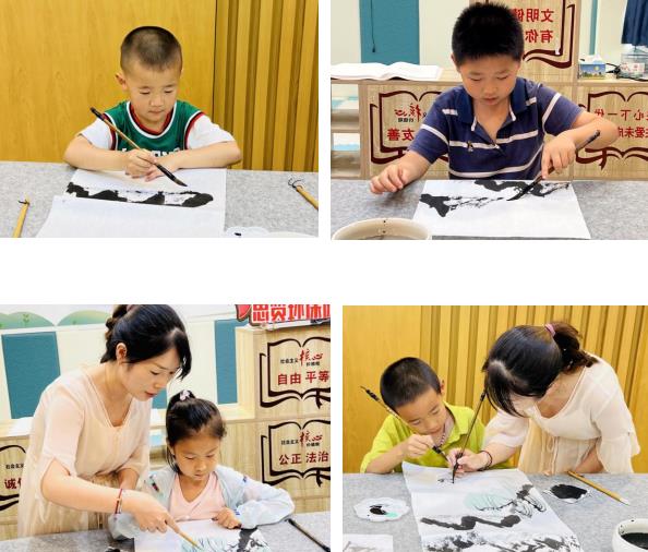 活動一開始,丹丹老師先是給孩子們普及了一下國畫知識,中國畫作為四大國粹之一,不僅是一門藝術(shù),更是一種修心養(yǎng)性的法門。表達的是內(nèi)在情感和意境,講究的是氣韻和筆墨的形質(zhì)。一筆一畫之間,盡顯柔情與豪邁。山水畫,是歷代文人的精神家園,詩情畫意,寄情山水之間。山石是山水畫的主體,是畫好山水畫的關(guān)鍵。古人講“石為山之骨”,故有“畫山先畫石”之說。