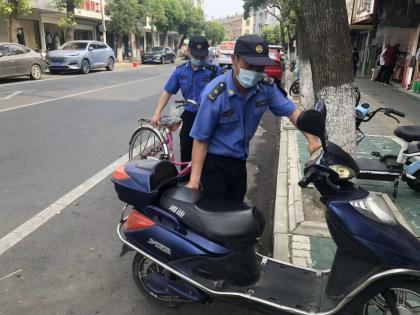 為進一步規(guī)范非機動車停車秩序,執(zhí)法隊員按照宣傳教育與日常整治相結(jié)合的原則,重點對轄區(qū)內(nèi)超市、銀行、農(nóng)貿(mào)市場周邊等車流量密集的路段,影響到群眾出行和市容市貌的亂停亂放非機動車進行集中整治,對存在違規(guī)行為的車主進行文明教育,引導(dǎo)車主按照“停車進線,方向一致”的原則文明停車,營造良好的停車秩序。