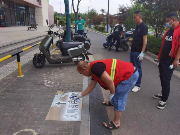 社區(qū)志愿者對石埠灣菜場周邊非機動車位上噴涂宣傳標語,志愿者手拿噴漆工具,彎腰將沿路停車位進行了噴涂。嶄新的標語格外顯眼,意在指引居民文明有序、規(guī)范停車,寄托著文明的內涵和對居民的期盼。