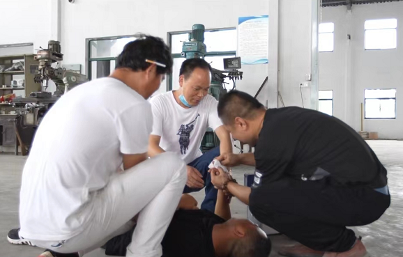機(jī)械傷害模擬環(huán)節(jié),網(wǎng)格員全程協(xié)助,認(rèn)真觀看演練效果。安全員向指揮報(bào)告?zhèn)榘l(fā)生地和傷情狀況;警戒聯(lián)絡(luò)組組長(zhǎng)率小組成員停止機(jī)械運(yùn)轉(zhuǎn),迅速拉起警戒線,引導(dǎo)周圍職工撤離到安全區(qū)并疏散圍觀人員,為現(xiàn)場(chǎng)救護(hù)提供了足夠的場(chǎng)地;后勤保障組負(fù)責(zé)聯(lián)系當(dāng)?shù)蒯t(yī)院,并由企業(yè)醫(yī)療救護(hù)組展開急救。