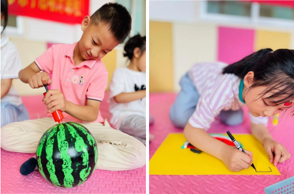 除了講故事,活動的另一個“重頭戲”便是動手環(huán)節(jié)。老師布置了充西瓜球和畫西瓜的小任務(wù),并為每一個孩子發(fā)放了充氣筒以及繪畫工具。現(xiàn)場指揮大家為西瓜型玩具球充氣。孩子們一個個手拿充氣筒便開始了嘗試,有的小朋友力氣小,西瓜球也小,但是在老師和家長的不斷鼓勵下,最終完成了游戲任務(wù),他們充滿自豪的向大家展示著自己的西瓜球。在畫西瓜的過程中,孩子們都很認真,將西瓜小心翼翼的貼在黃色的卡紙上,并寫下自己的名字。