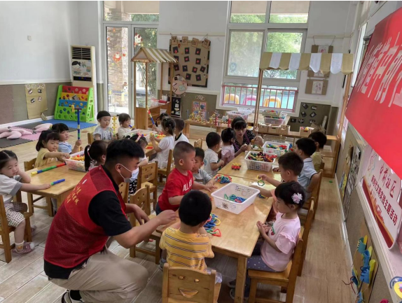 7月4日上午,南京市江寧區(qū)東山街道中前社區(qū)新時代文明實踐站志愿者聯(lián)合德美幼兒園開展智慧搭建課程。致力于讓孩子們在玩中學習知識,在玩中發(fā)展智力。