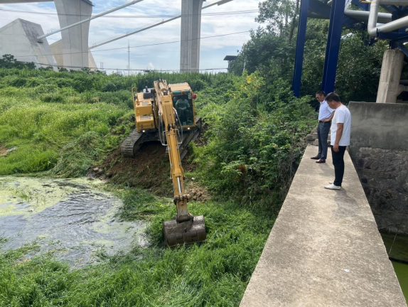 隨后進行分工合作,有的在岸上、有的入水,運用網(wǎng)兜、打撈船對浮萍進行“攔截”。為提高辦事效率、有效清理河道浮萍,又請來挖機上陣幫忙,將雜草浮萍撈上岸后進行集中清運。