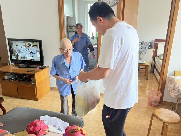 夏季天氣燥熱,殘協(xié)志愿者還為空巢殘疾老人們送來水果,并為老人們做起力所能及的家務(wù),幫助他們做打掃房間、修換燈泡等日?,嵤隆@先藗儗垍f(xié)志愿者的貼心服務(wù)表示感謝,對著志愿者豎起大拇指。