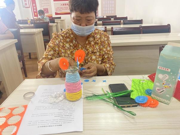 在討論到積極提倡低碳出行時(shí),李阿姨開心地說到:“我家兒子最近剛買了一輛電動(dòng)車,既省錢,又能減少尾氣排放,社區(qū)還在家門口安裝了充電樁,別提多方便了。”大家聽了紛紛表示認(rèn)可?;顒?dòng)最后,大家用平時(shí)收集到的玻璃瓶,以及廢棄的紐扣進(jìn)行紐扣花的制作,制作過程中,社區(qū)工作人員大概講解手工玻璃瓶步驟,大家充分發(fā)揮想象力,制造出了一個(gè)個(gè)妙趣橫生的作品,并通過合影留念來記錄這一美好瞬間。