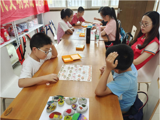 開班第一天,為保證孩子們更好地遵守相關(guān)紀(jì)律要求,老師帶領(lǐng)孩子們一起制定了暑期班紀(jì)律規(guī)定,并將兒童根據(jù)年齡、年級分組,安排專門的大學(xué)生志愿者負(fù)責(zé)。開班儀式上,孩子們還在志愿者的引導(dǎo)下,通過下象棋、畫鵝卵石豐富自己的精神,鍛煉動手能力,拉近彼此之間的關(guān)系。