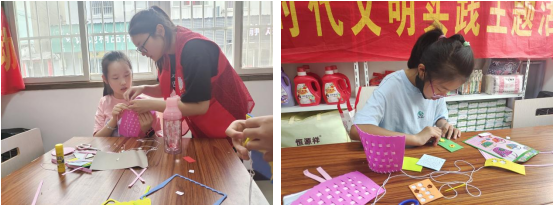 “……大家做完這個(gè)編織籃后,可以放在家里當(dāng)裝飾品,也可以當(dāng)成收納盒,裝一些小零食、小玩具。”志愿者向孩子們講解了編織籃的制作方法和意義后,將提前準(zhǔn)備好的材料分發(fā)了下去。孩子們在志愿者的指導(dǎo)下,依照著說明書,將海綿條從材料的開口處一上一下穿好拉齊,用塑料針縫制編織籃的底和提手,再用裝飾貼片在編織籃上點(diǎn)綴漂亮的小花、蝴蝶結(jié)、紅心,完成了自己的作品。