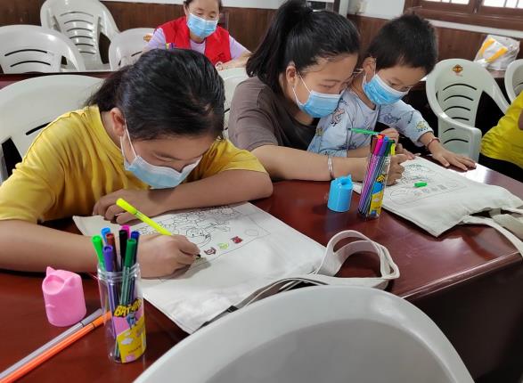 手繪環(huán)節(jié),大家拿起各色顏料細(xì)致涂抹,紅的綠的黃的白的顏料在靈巧的雙手間生成七彩斑娟的、符合畫(huà)面的顏色,慢慢地帆布包開(kāi)始生動(dòng)、鮮活起來(lái)。孩子們用色彩鮮明的顏色、耐心細(xì)致地繪出對(duì)祖國(guó)的熱愛(ài)??粗约旱某晒蠹业哪樕隙悸冻鰻N爛的笑容。