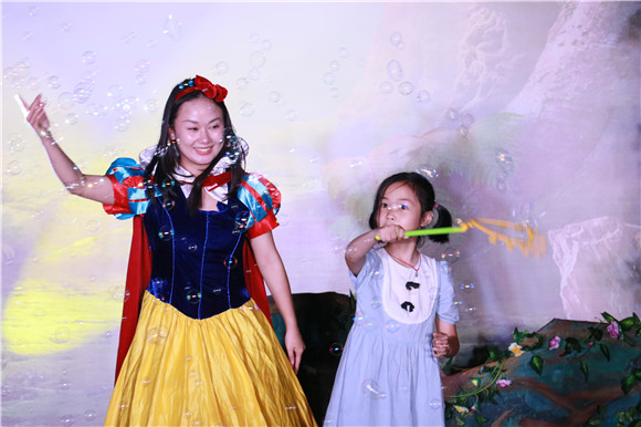 活動(dòng)剛開(kāi)始,身穿白雪公主裙子的演員亮相舞臺(tái)中央,瞬間點(diǎn)燃全場(chǎng),現(xiàn)場(chǎng)歡呼聲一片,不少小朋友主動(dòng)上臺(tái),與“白雪公主”夢(mèng)幻互動(dòng),在吹起的泡泡中感受童話般的世界。“哪位勇敢的爸爸自愿上臺(tái)配合牧馬鞭表演?”在小丑演員的鼓勵(lì)下,爸爸們鼓起勇氣上臺(tái),手拿一張報(bào)紙,配合著小丑演員揚(yáng)起的聲如鞭炮的牧馬鞭,臺(tái)下人員無(wú)不屏住呼吸,見(jiàn)證著令人緊張刺激的一幕。