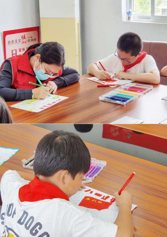 在志愿者的帶領(lǐng)下,小朋友們在白紙上畫出中國人民解放軍軍旗,并將自己對解放軍的真誠祝福和崇高敬意一同書寫在紙上,“等我長大以后也要成為解放軍叔叔中的一員,為祖國發(fā)展貢獻自己的力量。”畫紙上一面面軍旗飄揚,孩子們在紙上寫下對人民解放軍最純真的感激與敬意。