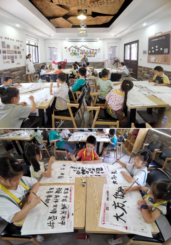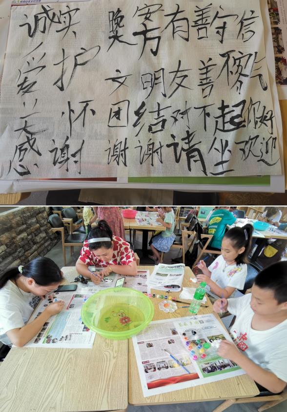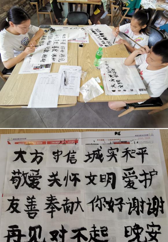 本次活動(dòng)邀請(qǐng)了老黨員笪本萬(wàn),活動(dòng)伊始,笪爺爺教孩子們寫(xiě)毛筆字。首先向孩子們講解了什么是毛筆字,寫(xiě)毛筆字需要用到的材料以及書(shū)寫(xiě)規(guī)范,還告訴小朋友們練習(xí)毛筆字對(duì)自己書(shū)法能力提升有一定的好處,在今后的學(xué)習(xí)中也至關(guān)重要。在笪爺爺?shù)南ば闹笇?dǎo)下,孩子們個(gè)個(gè)滿懷激情認(rèn)真書(shū)寫(xiě)著,橫豎撇捺、起筆收筆,從容地書(shū)寫(xiě)出一幅幅或端莊、或娟秀、或雄勁有力的書(shū)法作品。